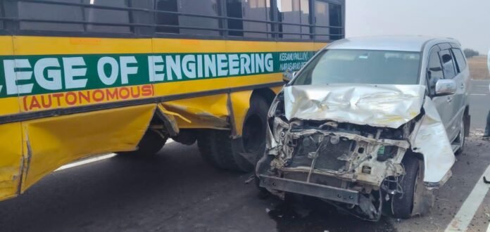 చిలకలూరిపేట : మండల పరిధిలోని పసుమర్తి సమీపంలో నూతన జాతీయ రహదారిపై సోమవారం ఉదయం పెను ప్రమాదం తృటిలో తప్పింది.ఈశ్వర్ ఇంజినీరింగ్ కళాశాలకు చెందిన బస్సును ఒక ఇన్నోవా వాహనం బలంగా ఢీకొట్టింది.కళాశాల బస్సు ఎప్పటిలాగే ఇంకొల్లు నుండి నరసరావుపేట వైపు విద్యార్థులతో వెళ్తుండగా,పసుమర్తి వద్ద ఈ ప్రమాదం చోటు చేసుకుంది.వేగంగా వచ్చిన ఇన్నోవా వాహనం నియంత్రణ కోల్పోయి బస్సును ఢీకొట్టింది.ప్రమాద సమయంలో బస్సులో ఎనిమిది మంది విద్యార్థులు ఉన్నట్లుసమాచారం.