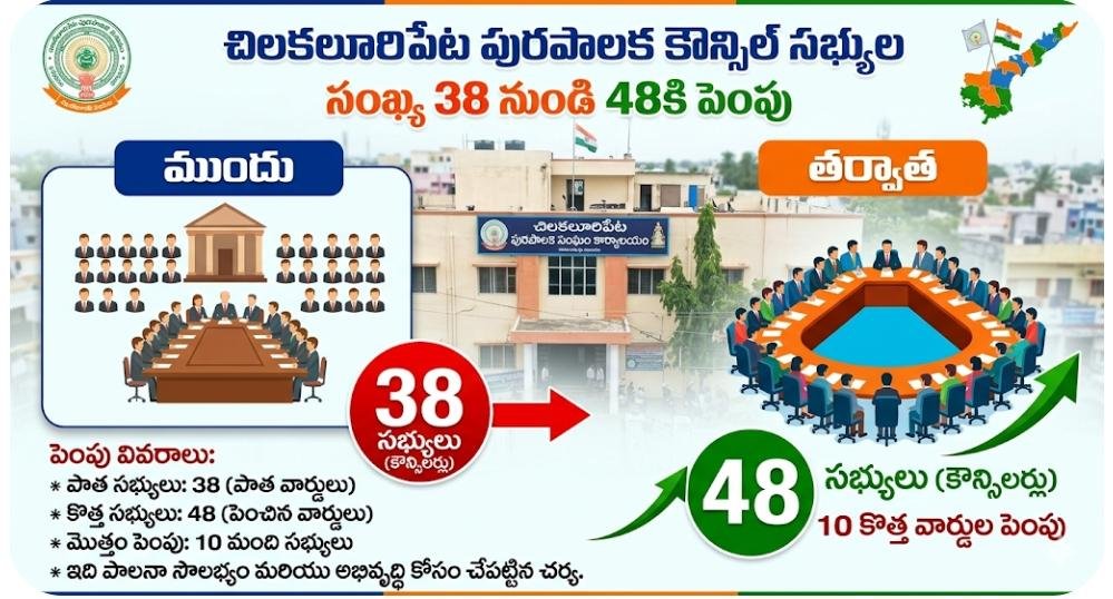 చిలకలూరిపేట: పట్టణ అభివృద్ధి మరియు పాలనా సౌలభ్యాన్ని దృష్టిలో ఉంచుకుని ఆంధ్రప్రదేశ్ ప్రభుత్వం చిలకలూరిపేట పురపాలక సంఘంలో వార్డుల సంఖ్యను పెంచుతూ కీలక నిర్ణయం తీసుకుంది. పెరుగుతున్న ఓటర్ల సంఖ్యకు అనుగుణంగా, ప్రజలకు మెరుగైన సేవలందించడమే లక్ష్యంగా గతంలో ఉన్న 38 వార్డులను ఇప్పుడు 48కి పెంచుతూ ఉత్తర్వులు జారీ చేసింది. దీనితో జిల్లాలోనే అత్యధికంగా 48 మంది కౌన్సిల్ సభ్యులు కలిగిన ఏకైక మున్సిపాలిటీగా చిలకలూరిపేట సరికొత్త రికార్డును సృష్టించింది.