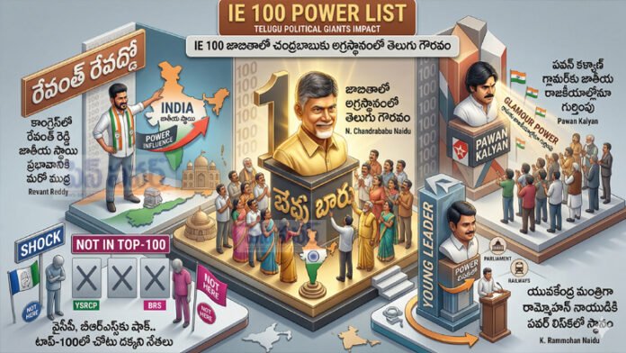 తెలుగు రాష్ట్రాల నాయకులు మరోసారి తమ సత్తా చాటుకున్నారు. దేశంలోనే ప్రత్యేక గుర్తింపు సాధించారు. ప్రఖ్యాత జాతీయ దినపత్రిక ఇండియన్ ఎక్స్ప్రెస్ తాజాగా ప్రకటించిన ‘IE 100’: 2026 పేరుతో అత్యంత శక్తివంతమైన భారతీయుల జాబితాను ప్రకటించింది. అందులో తెలుగు ప్రముఖులకు చోటు దక్కింది. దేశ గమనాన్ని శాసించగల వందమంది ప్రముఖులతో రూపొందించిన ఈ జాబితాలో తెలుగు నేతలకు అగ్రతాంబూలం దక్కడం విశేషం. ఏపీ సీఎం చంద్రబాబు, తెలంగాణ సీఎం రేవంత్ రెడ్డి, ఏపీ డిప్యూటీ సీఎం పవన్ కళ్యాణ్ ఈ జాబితాలో ఉన్నారు. అందరికంటే మెరుగైన స్థితిలో ఏపీ సీఎం చంద్రబాబు ఉండడం విశేషం.దేశంలో అత్యంత శక్తివంతమైన వ్యక్తులను ఈ జాబితాలో చేర్చారు. అందులో ఏపీ సీఎం చంద్రబాబు 13వ స్థానంలో నిలవడం విశేషం. అత్యంత శక్తివంతమైన తెలుగు నాయకుడిగా ఆయన తన ఆధిపత్యాన్ని చాటుకున్నారు. కేంద్రంలో సంకీర్ణ ప్రభుత్వ ఏర్పాటులో కీలక పాత్ర పోషించడం, ఏపీ పునర్నిర్మాణంలో ఆయన చూపుతున్న చొరవ జాతీయ స్థాయిలో సైతం గుర్తింపు పొందింది. ఇక తెలంగాణ రాజకీయాల్లో సంచలనంగా మారారు సీఎం రేవంత్ రెడ్డి. ఆయన ఈ జాబితాలో 25వ స్థానంలో నిలిచారు. కాంగ్రెస్ పార్టీలో రాహుల్ గాంధీ తర్వాత అత్యంత ప్రభావశీలుడైన నేతగా రేవంత్ గుర్తింపు సాధించారు. మల్లికార్జున్ ఖర్గే, ప్రియాంక గాంధీ వంటి సీనియర్లను వెనక్కి నెట్టి రేవంత్ రెడ్డి ఈ జాబితాలో ముందంజలో ఉండడం విశేషం.మరోవైపు ఏపీ డిప్యూటీ సీఎం పవన్ కళ్యాణ్68వ స్థానంలో నిలిచారు. మరోసారి తన గ్లామర్ ను నిరూపించుకున్నారు. జాతీయస్థాయిలో మంచి నాయకుడిగా గుర్తింపు పొందారు. కేంద్ర మంత్రి గింజరాపు రామ్మోహన్ నాయుడు సైతం 90 స్థానంలో నిలిచారు. కేంద్ర క్యాబినెట్లో తెలుగు రాష్ట్రాల నుంచి యువనేతగా ఎంపికైన ఆయన మంచి వాగ్దాటితో ముందుకు సాగుతున్నారు. అయితే ఏపీలో వైఎస్ఆర్ కాంగ్రెస్ పార్టీ, తెలంగాణలో బీఆర్ఎస్ నుంచి ఒక్కరంటే ఒక్క నేతకు కూడా ఈ జాబితాలో స్థానం దక్కకపోవడం విశేషం. ఒకప్పుడు అద్భుత విజయంతో జాతీయ స్థాయిలో మంచి గుర్తింపు సాధించారు జగన్మోహన్ రెడ్డి. కానీ ఇప్పుడు అదే స్థాయిలో ఓటమితో దారుణంగా దెబ్బతిన్నారు రాజకీయంగాను. అయితే ఒక జాతీయ పత్రిక ప్రకటించిన జాబితాలో ఆ రెండు పార్టీలకు ఇప్పుడు చోటు దక్కకపోవడం మాత్రం నిజంగా లోటు