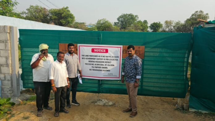 ఎట్టకేలకు ఆక్రమిత ప్రభుత్వ భూమిలో దుండిగల్‌ రెవెన్యూ అధికారులు, నోటీసు బోర్డు పెట్టారు.. మేడ్చల్–మల్కాజిగిరి జిల్లా దుండిగల్‌ మండలం, బౌరంపేట్ గ్రామ పరిధిలోని, సర్వే నెంబర్ 166/1 భూమిని, 166/9/2 భూమిగా, 17-01-2026న జారీ చేసిన కలెక్టర్ ప్రొసీడింగ్ నెంబర్: A1/899/2024 పై, స్థానికుల‌ అభ్యంతరాల మేరకు..! మేడ్చల్ జిల్లా కలెక్టరేట్‌‌‌ ప్రజావాణి ఫిర్యాదు మేరకు.. కలెక్టర్ మను చౌదరి 13-04-2026న రద్దుచేస్తూ, బుధవారం మేడ్చల్ జిల్లా కలెక్టర్ ఉత్తర్వులు జారీచేశారు.. సర్వే నెం.166/9/2 భూమిని జిల్లా కలెక్టర్ ఆదేశాల మేరకు, నిన్న సంబంధిత భూమిని ప్రభుత్వ అధీనంలోకి తీసుకున్నారు.. ప్రొసీడింగ్ నెంబర్.A1/899/2024 (తేదీ: 13-04-2026) ప్రకారం తదుపరి ఆదేశాలు వచ్చే వరకు ఆ భూమిలోకి ప్రవేశాన్ని నిషేధించారు. దుండిగల్‌ తహసీల్దార్ రాజేశ్వర్ రెడ్డి ఆద్వర్యంలో కలెక్టర్ ఆదేశాలను అమలు చేస్తూ.. నోటీసు బోర్డును ఏర్పాటు చేశారు..