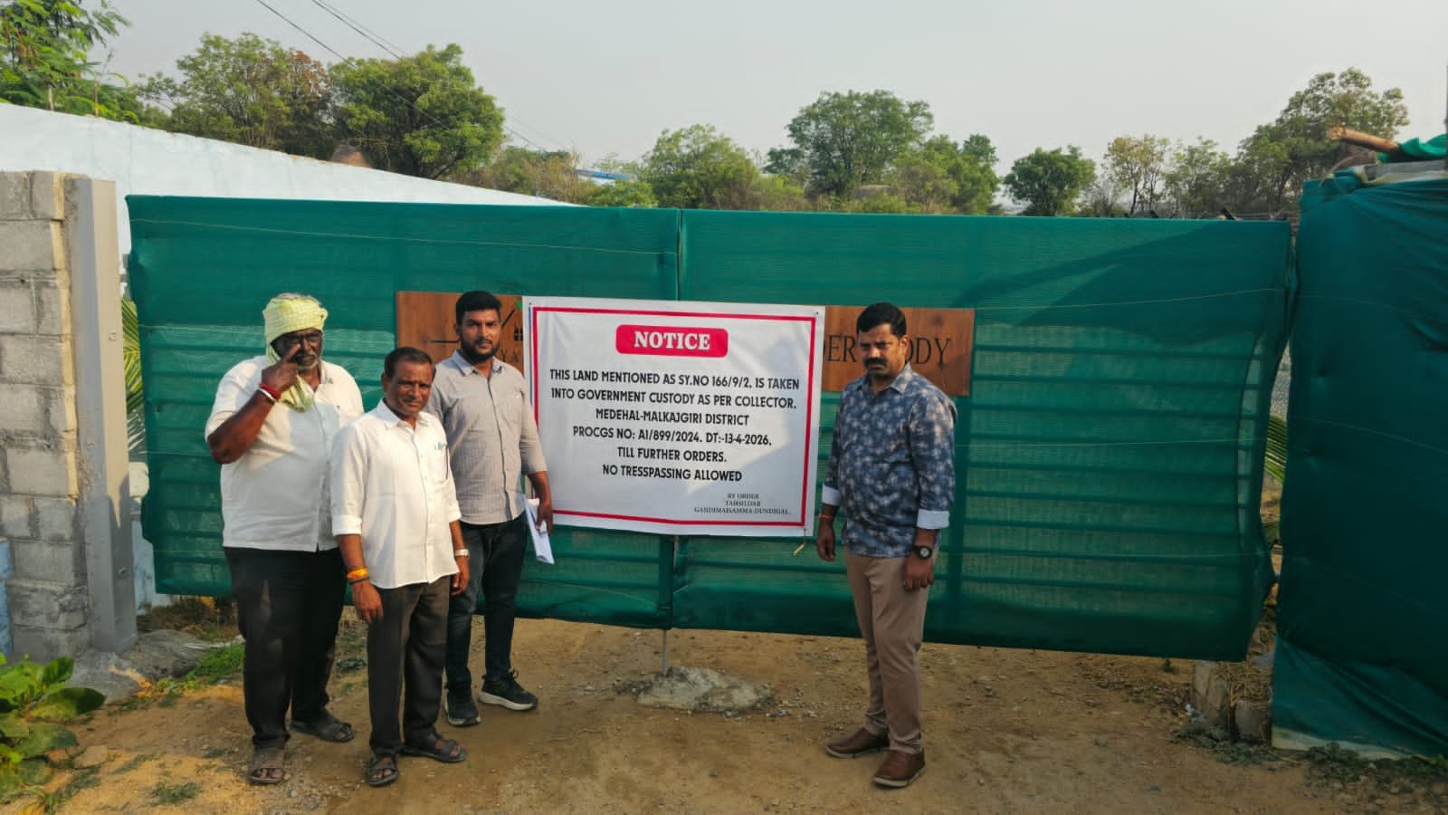 మేడ్చల్ జిల్లా కలెక్టరేట్‌‌‌‌లో సమస్యలను, తక్షణ పరిష్కరం కోసం, వారం వారం నిర్వహిస్తున్న, ప్రజావాణి కార్యక్రమంలో అందిన ఓ ఫిర్యాదుకు జిల్లా కలెక్టర్ మిక్కిలినేని మను చౌదరి వెంటనే స్పందించారు.. రూ.100 కోట్లు విలువైన ప్రభుత్వ భూమిని స్వాధీన పరుచుకుని బుధవారం తహశీల్దార్ ఆధ్వర్యంలో నోటీసు బోర్డును ఏర్పాటు చేశారు.. వివరాల్లోకి వెళ్ళితే.. అకుల సతీష్ అండ్ టీమ్ తెలిపిన వివరాల ప్రకారం.. బౌరంపేట్ సర్వే నెంబర్ 166/1, ఉన్న దాదాపు 5 ఎకరాలు, సుమారు రూ.100 కోట్ల విలువైన ప్రభుత్వ భూమిని.. ఎక్స్ సర్వీస్ మెన్‌ పట్టా పేరుతో అక్రమంగా ఆక్రమించి, దాన్ని సక్రమం చేసుకోవడానికి తప్పుడు ప్రొసీడింగ్ పొందిన విషయంపై, పత్రికా విలేకరుల సమావేశం నిర్వహించామని, ఈ నేపథ్యంలో తమపై దాడులు చేసి, అక్రమ కేసులు పెట్టిన జీవన్‌రెడ్డి వ్యవహారాన్ని తీవ్రంగా ఖండిస్తున్నామని ఆకుల సతీష్ బుధవారం ఓ ప్రకటనలో పేర్కొన్నారు.. ఈ మేరకు సోమవారం మేడ్చల్ జిల్లా కలెక్టరేట్  ప్రజావాణిలో ఆధారాలతో ఫిర్యాదు చేయగా కలెక్టర్ వెంటనే స్పందించారని సతీష్ తెలిపారు..