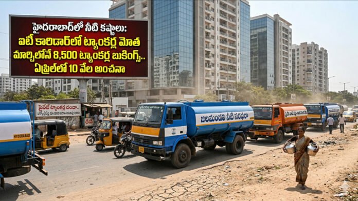 హైదరాబాద్‌లో భూగర్భ జలాలు తగ్గడంతో నీటి ట్యాంకర్ల డిమాండ్ భారీగా పెరిగింది. మార్చిలోనే రోజువారీ ట్యాంకర్ల బుకింగ్స్ 8500 మార్కును చేరగా.. ఏప్రిల్ నాటికి ఇది 10 వేలకు చేరుతుందని జలమండలి అంచనా వేస్తోంది. గచ్చిబౌలి, కొండాపూర్, మాదాపూర్ వంటి ఐటీ ప్రాంతాల్లో బోర్లు ఎండిపోవడంతో ప్రైవేట్ ట్యాంకర్ల ధరలు పెరిగాయి. జలమండలి 1100 ట్యాంకర్లతో సరఫరాను ముమ్మరం చేసినప్పటికీ.. పెరుగుతున్న ఎండల దృష్ట్యా నీటి ఎద్దడి మరింత పెరిగేలా కనిపిస్తోంది.సమ్మర్ వచ్చిందంటే చాలు హైదరాబాద్ నగరంలో నీటి ఎద్దడి మెుదలవుతుంది. ఇది ప్రతి ఏడాది ఉండే తంతే. అయితే ఈసారి కాస్త ముందుగానే నగర ప్రజలకు నీటి కష్టాలు మెుదలయ్యాయి. నగరంలో వేసవి వేడి సెగలు మొదలవకముందే మంచినీళ్ల కష్టాలు ముదిరిపోయాయి. వాతావరణ మార్పులు, అడుగంటిపోతున్న భూగర్భ జలాల కారణంగా నగరవాసులు చుక్క నీటి కోసం ట్యాంకర్లపై ఆధారపడాల్సిన పరిస్థితి ఏర్పడింది. గత నెల రోజుల్లోనే నీటి ట్యాంకర్ల డిమాండ్ అనూహ్యంగా పెరగడం ఆందోళన కలిగిస్తోంది. ఫిబ్రవరి చివరలో రోజుకు సగటున 5 వేల ట్యాంకర్ల కంటే తక్కువ డిమాండ్ ఉండగా.. మార్చి నెలాఖరు నాటికి ఆ సంఖ్య 8,500కు చేరుకుంది. ఏప్రిల్ నాటికి ఈ డిమాండ్ రోజుకు 10 వేల ట్యాంకర్లకు చేరుకోవచ్చని జలమండలి అంచనా వేస్తోంది.ముఖ్యంగా హైదరాబాద్ నగరం పశ్చిమ భాగంలోని ఐటీ కారిడార్‌లో పరిస్థితి ఆందోళనకరంగా ఉంది. కొండాపూర్, గచ్చిబౌలి, మాదాపూర్, కూకట్‌పల్లి, నిజాంపేట వంటి ప్రాంతాలతో పాటు ఉప్పల్, మల్కాజిగిరి, అమీర్‌పేట ఏరియాల్లో 50 శాతానికి పైగా బోర్లు అడుగంటిపోయాయి. పెద్ద పెద్ద అపార్ట్‌మెంట్‌లు, విల్లాలు ఇప్పుడు పూర్తిగా ట్యాంకర్ల మీదే ఆధారపడుతున్నాయి. హాస్టళ్లు, వాణిజ్య సముదాయాల్లో నీటి వినియోగం ఎక్కువగా ఉండటంతో నిత్యం బోర్లపైనే