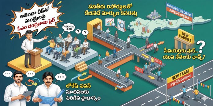 కేబినెట్ అజెండా లీక్పై ముఖ్యమంత్రి చంద్రబాబు నాయుడు వ్యక్తం చేసిన తీవ్ర అసంతృప్తి, ఏపీ మంత్రివర్గంలో త్వరలోనే మార్పుచేర్పులు జరిగే అవకాశాలపై రాజకీయ వర్గాల్లో చర్చను వేడెక్కిస్తోంది. మున్సిపల్ ఎన్నికలను దృష్టిలో పెట్టుకుని పనితీరు, క్రమశిక్షణ, ప్రజా మైలేజ్ ఆధారంగా కొత్త సమీకరణాలకు ఆయన శ్రీకారం చుట్టే అవకాశం ఉందన్న అంచనాలు బలపడుతున్నాయి.
