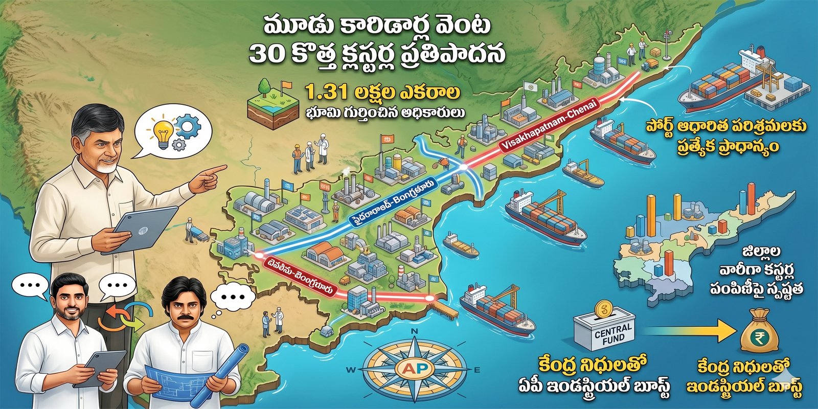 మూడు జాతీయ ఇండస్ట్రియల్ కారిడార్లను ఆధారంగా చేసుకుని ఆంధ్రప్రదేశ్లో మరో 30 కొత్త ఇండస్ట్రియల్ క్లస్టర్ల ఏర్పాటుకు రాష్ట్ర ప్రభుత్వం వేగంగా అడుగులు వేస్తోంది. ఇప్పటికే ఉన్న 20 క్లస్టర్లకు ఇవి జతకావడంతో మొత్తం సంఖ్య 50కి చేరుకోనుండగా, భారీ భూసేకరణతో పాటు పోర్ట్ ఆధారిత పరిశ్రమలకు కొత్త ఊపు రానుందనే అంచనాలు వ్యక్తమవుతున్నాయి.