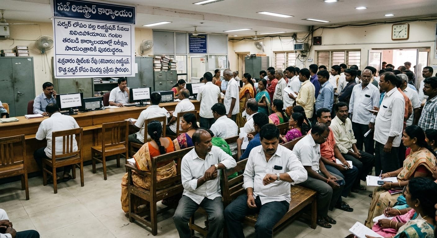 ఉదయం నుంచి రాష్ట్రవ్యాప్తంగా సబ్ రిజిస్ట్రార్ కార్యాలయాల్లో సాంకేతిక లోపం కారణంగా రిజిస్ట్రేషన్ ప్రక్రియ పూర్తిగా నిలిచిపోయి, ప్రజలు తీవ్ర ఇబ్బందులు ఎదుర్కొన్నారు. పాత సర్వర్ మొరాయించడంతో ఈ సమస్య తలెత్తగా, సాయంత్రం వరకు పునరుద్ధరణ పనులు పూర్తి చేసి, శుక్రవారం బుక్ చేసుకున్న స్లాట్లను రేపటికి మార్చారు అధికారులు.